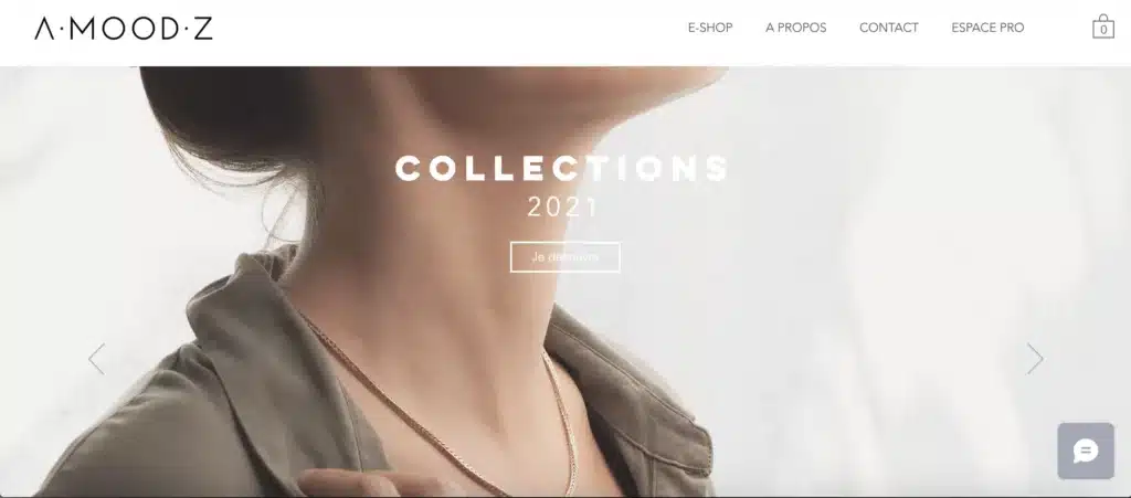 A.Mood.Z est un site Internet ecommerce de bijoux. La page d’accueil est attrayante avec des images plein écran des bijoux à vendre accompagnées d’un bouton d’appel à l’action. La page d’accueil intègre également un flux social (Instagram ou TikTok), un icône panier et un lien vers le blog, reflétant l’importance croissante des réseaux sociaux visuels dans la présentation des produits.