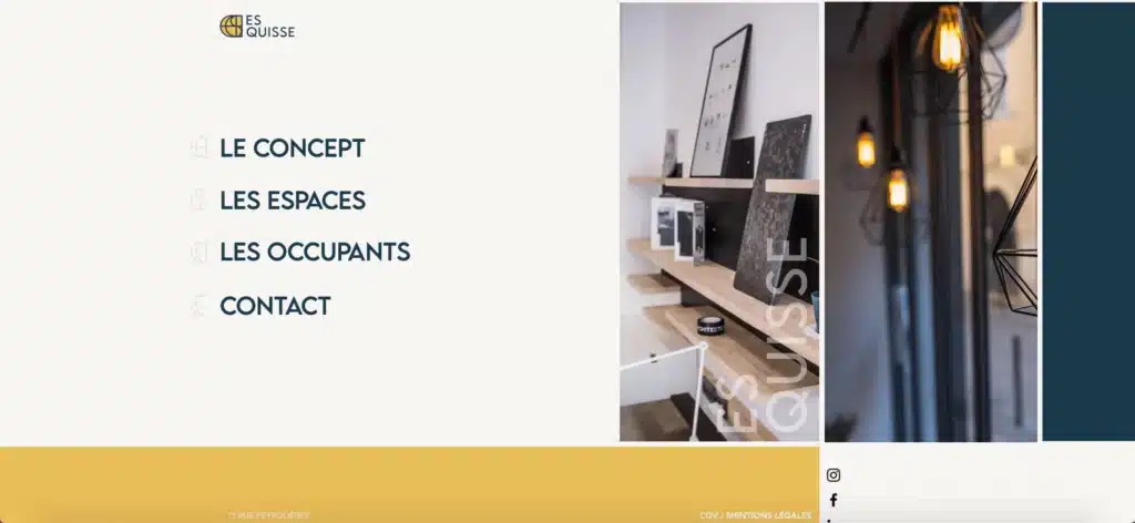 Esquisse Coworking est un lieu de coworking sur les thématiques de l’habitat, de l’architecture et du design. Ca se ressent d’ailleurs bien sûr dans leur site web qui se veut légèrement disruptif (pas moyen de scroller sur la page d’accueil) et assez dynamique : pas mal d’animations sur les pages suivantes qui rendent le tout assez sympathique à visiter. Le site a bien été réalisé sur Wix mais ils ont fait appel à des pros et découvrez notre comparateur d’agence wix.