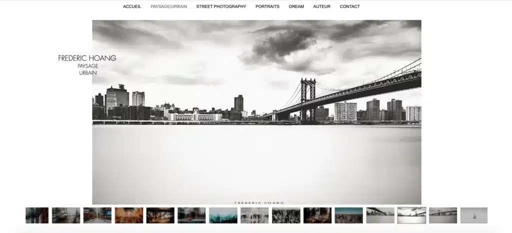 Frederic Hoang est un photographe français ayant fait le choix artistique d’une photographie sombre, voire angoissante. La lumière occupe une place centrale dans son œuvre et son site web réalisé avec Wix reflète bien cela. Le design particulièrement épuré, géométrique, et le blanc choisi comme arrière-plan met en valeur ces impressionnantes photographies. Ce menu, dont la disposition si haute est peu habituelle, est l’un des rares éléments qui habillent la page. La galerie défilante permet une vision pleine page des photographies. Un très bel exemple de site de photographe, simple, graphique et très fonctionnel.