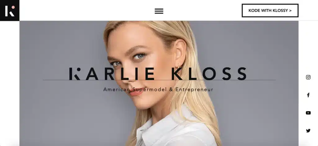Mannequin mondialement reconnue, Karlie Kloss est également célèbre pour s’être lancée dans le développement web. “Kode with Klossy” en est d’ailleurs la preuve, cet autre site lui aussi réalisé sous Wix et dédié à la formation en code. À quoi ressemble le portfolio d’un supermodel ? Un site esthétique, propre et épuré présentant les différents projets auxquels elle a contribué. Peu de textes, sauf pour la biographie, l’accent est mis sur le visuel : de belles photographies impactantes accompagnent chaque élément ! L’ensemble est efficace et assure une présence en ligne alors nécessaire à un tel niveau de notoriété.