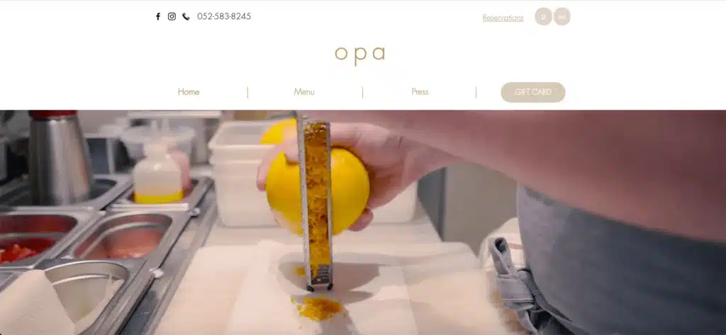 Opa est un restaurant vegan de Tel Aviv. Très simple, tout en affichant les informations attendues, ce site réalisé sous Wix reflète parfaitement l’esprit du restaurant. Dans sa simplicité, son graphisme et la qualité des quelques médias affichés, on arrive rapidement à se faire une idée de la cuisine proposée. Le vrai élément distinctif est cette belle vidéo en continue, en page d’accueil, présentant les produits et la préparation dans les cuisines. Le site est disponible en deux langues, hébreux et anglais. Il est possible de réserver une table, vous serez alors redirigé vers une solution de réservation en ligne, de plus en plus souvent directement intégrée à Wix via Wix Bookings ou des applications partenaires reconnues.