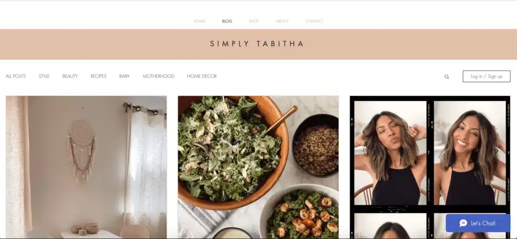 Simply Tabitha se classe aussi parmi les beaux exemples de blog lifestyle réalisés avec Wix. Le design est épuré, simple, tout en restant esthétique. Peu de fioritures, mais de jolies photos organisées en une mosaïque pleine page, un peu comme sur Pinterest. En termes de fonctionnalités, on retrouve notamment un chat, une fonction de recherche ainsi qu’un espace de connexion. Dans chaque article, photos et textes s’alternent joliment. Un bandeau en pied de page permet d’accéder rapidement aux derniers posts publiés, et un formulaire permet de laisser des commentaires. Toutes les fonctionnalités attendues d’un blog !