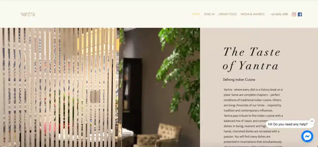 Yantra est un restaurant indien situé à Singapour. Ce site esthétique réalisé sous Wix propose un beau carrousel de photos des plats, avec la possibilité d’agrandir les images. Il est également possible de commander directement en ligne, cela est géré en interne et ne nécessite pas de redirection vers un autre site. Parmi les fonctionnalités intéressantes, on trouve notamment un chat intégré, souvent basé sur Wix Chat ou d’autres solutions natives, permettant une interaction directe sans nécessiter de connexion à un service externe.