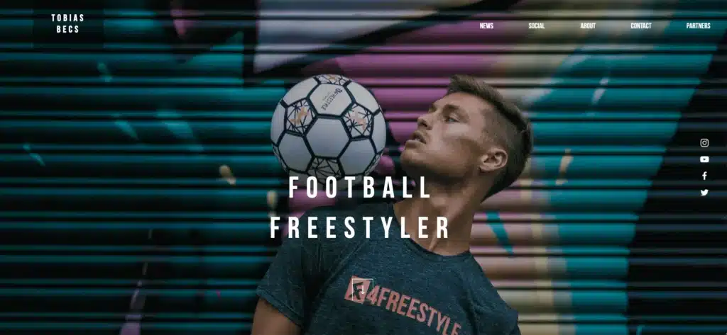 Tobias Becs est un freestyler football. Son choix de se présenter au public avec une grande image à l’entrée du site est très judicieux. Le bouton de réservation se trouve sur l’en-tête, et quand vous faites défiler la page d’accueil, vous verrez une grande vidéo de démonstration. Avec encore plus de vidéos et des tonnes d’images tout au long du site, c’est un merveilleux exemple de la façon de devenir créatif avec votre portfolio.