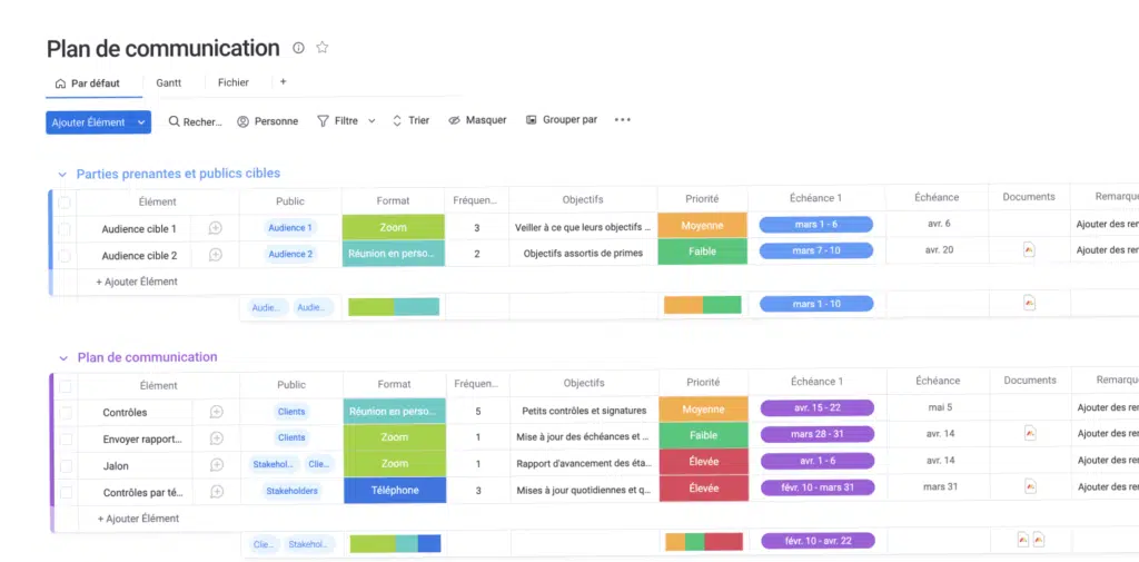 De façon plus opérationnelle, un travail stratégique peut mener à l'élaboration d'un plan de com qui détaille les outils et actions priorisés selon vos objectifs, généralement sur une période de 6 mois ou 1 an. Image : Monday