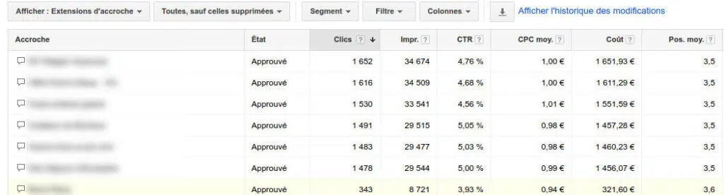 Certaines options sont payantes, d’autres non mais toutes permettent de prendre plus de place sur l’écran et d’augmenter le CTR (taux de clics). Une optimisation qui prend un peu de temps mais qui se ressent de façon certaine sur les performances globales.