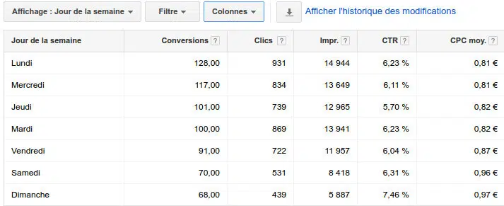 Adwords, rapport sur les performances en fonction des jours de la semaine