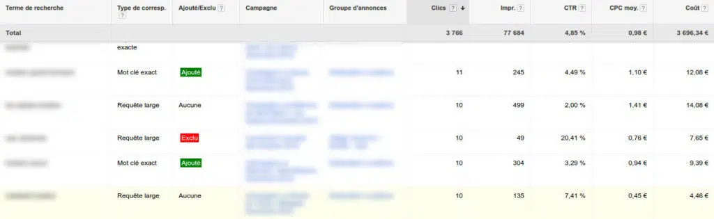 Le rapport lié aux termes de recherche est magique. Il permet de voir quels mots clés exacts ont tapé les internautes. Ce rapport, outre son intérêt dans la compréhension de ses clients et prospects, permet d’ajouter mais surtout d’exclure certains mots clés.