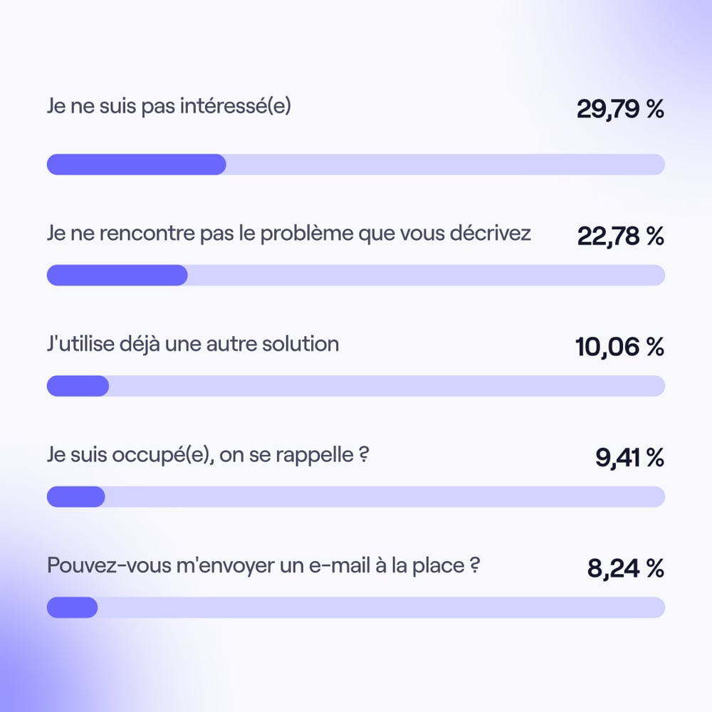« J’ai pas le temps. » « Je ne suis pas intéressé. » « Envoyez-moi un mail. » « On a déjà un prestataire. » Ces phrases, vous allez les entendre 100 fois. Préparez des réponses claires, pas des contre-attaques. L’objectif, c’est de garder la conversation ouverte.