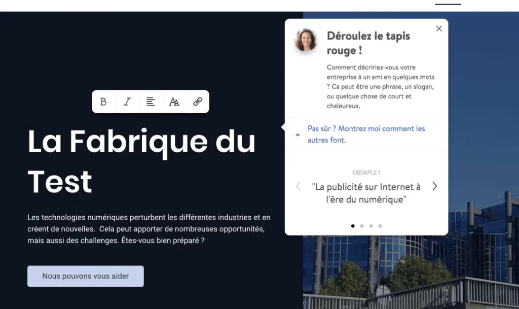 Certains de ces éditeurs, Jimdo notamment à travers son outil « Jimdo Dolphin », proposent même des solutions permettant de concevoir automatiquement votre site internet. Un assistant virtuel vous pose des questions au sujet de votre secteur d’activité et des objectifs que doivent vous permettre d’atteindre votre site web. Vous partagez votre charte graphique et, en quelques minutes, vous obtenez une v1 de votre site. Pas parfaite évidemment mais ça peut être une bonne base à personnaliser pour gagner beaucoup de temps !