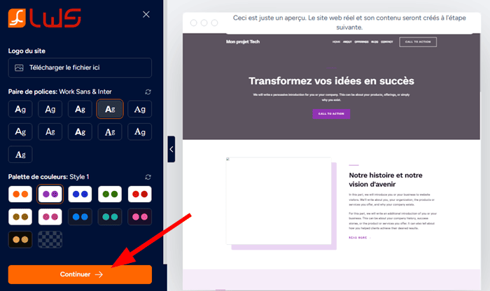 Vient ensuite le style de votre site. L’outil vous suggère un thème visuel cohérent avec votre activité (couleurs, typographies, mise en page).
