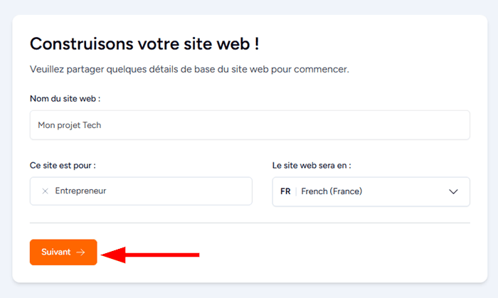 L’assistant vous demande alors quelques infos de base : nom du site, langue, type d’activité… Rien de technique ici, juste de quoi poser les fondations. Ces données serviront à générer le contenu initial de vos pages.
