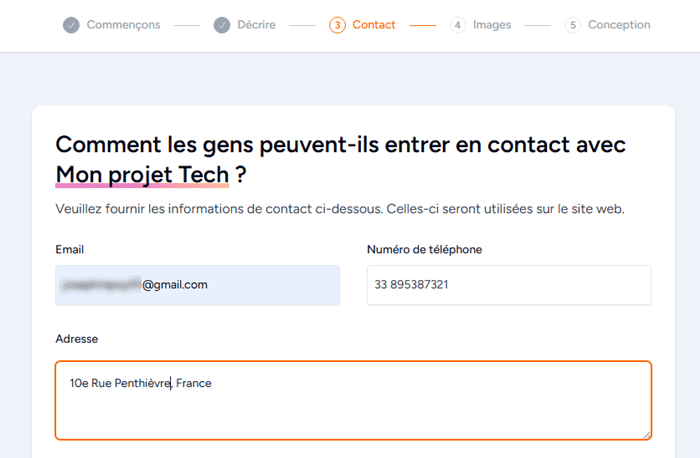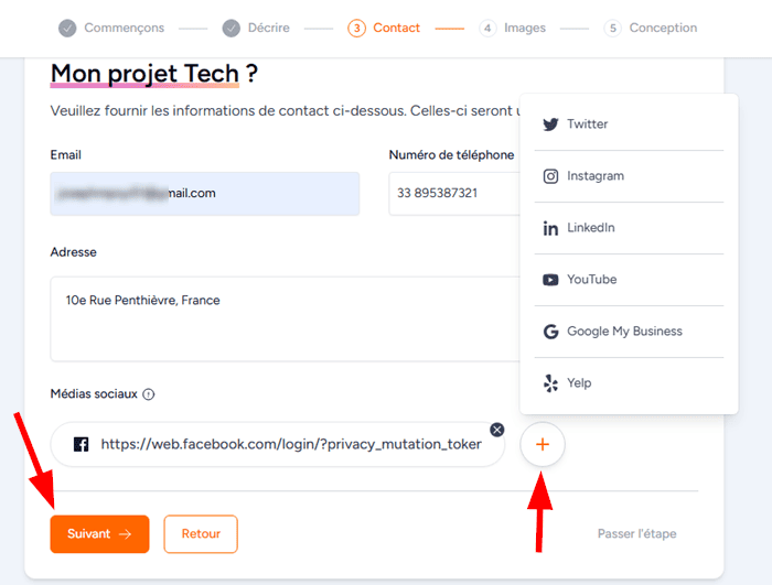 LWS vous propose ensuite de renseigner vos infos pratiques : adresse, numéro de téléphone, email, réseaux sociaux… Elles seront intégrées automatiquement dans la page de contact du site, mais aussi dans le pied de page si vous le souhaitez.