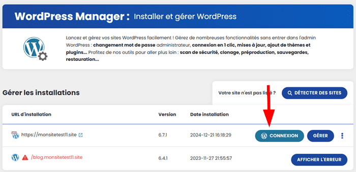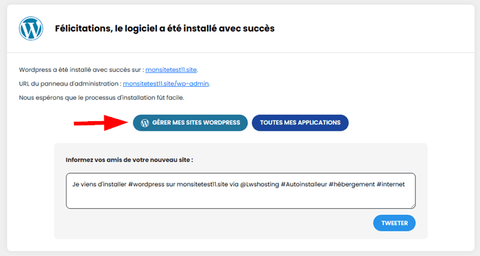 Dès que l’installation est finalisée, un bouton « Gérer » s’affiche. Cliquez dessus : vous serez redirigé vers le tableau de bord de votre site.