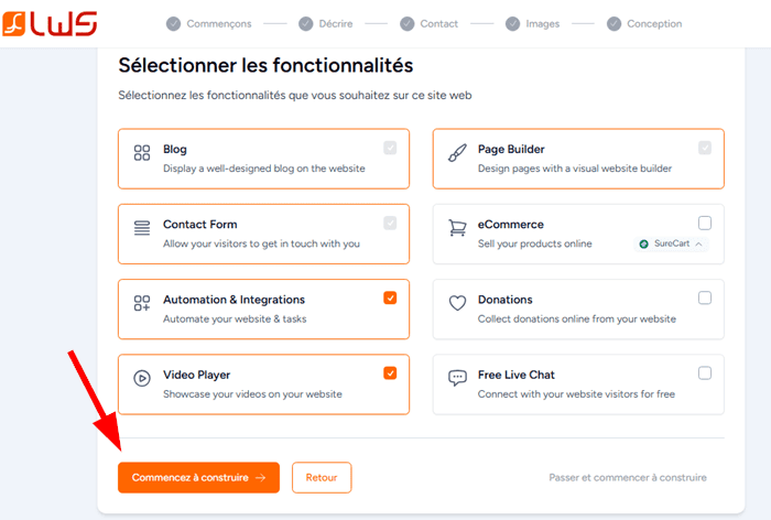 Ensuite, vous choisissez toutes les fonctionnalités que vous souhaitez activer sur votre site.