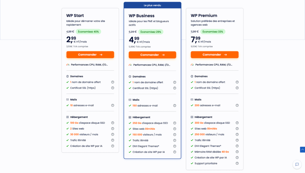 - La formule la plus avancée. Espace disque illimité, adresses email illimitées, plus de ressources (RAM/CPU), et une infrastructure pensée pour les sites à fort trafic.