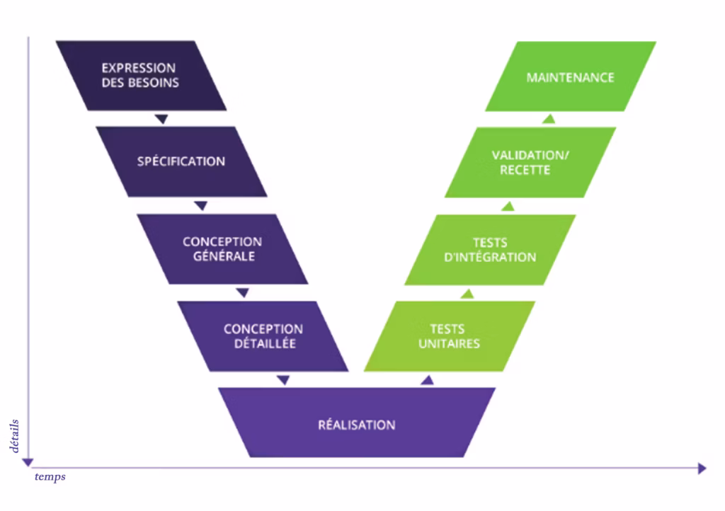 Chaque phase de réalisation est associée à une phase de validation. Cette méthode comprend donc toutes les étapes du cycle de vie d’un projet.