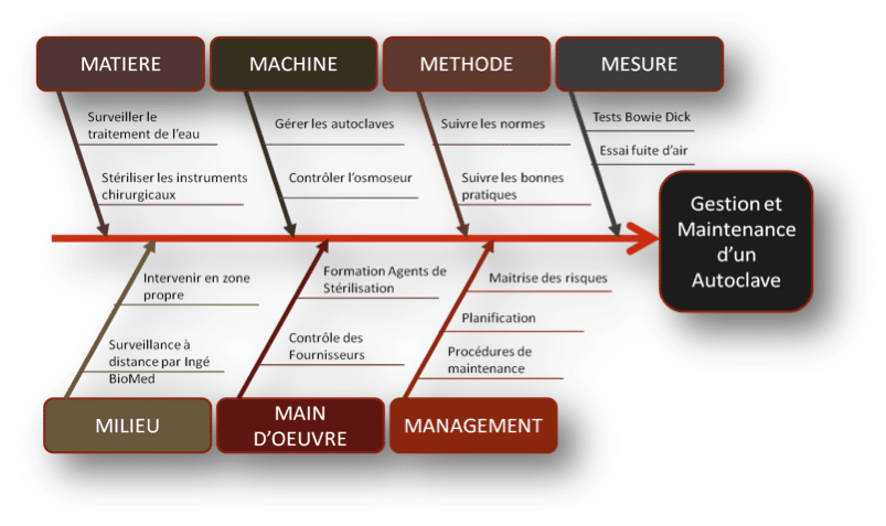 - Basé sur les 5M : Main-d’œuvre, Méthodes, Matériel, Milieu, Matières (+ Mesures/Management).