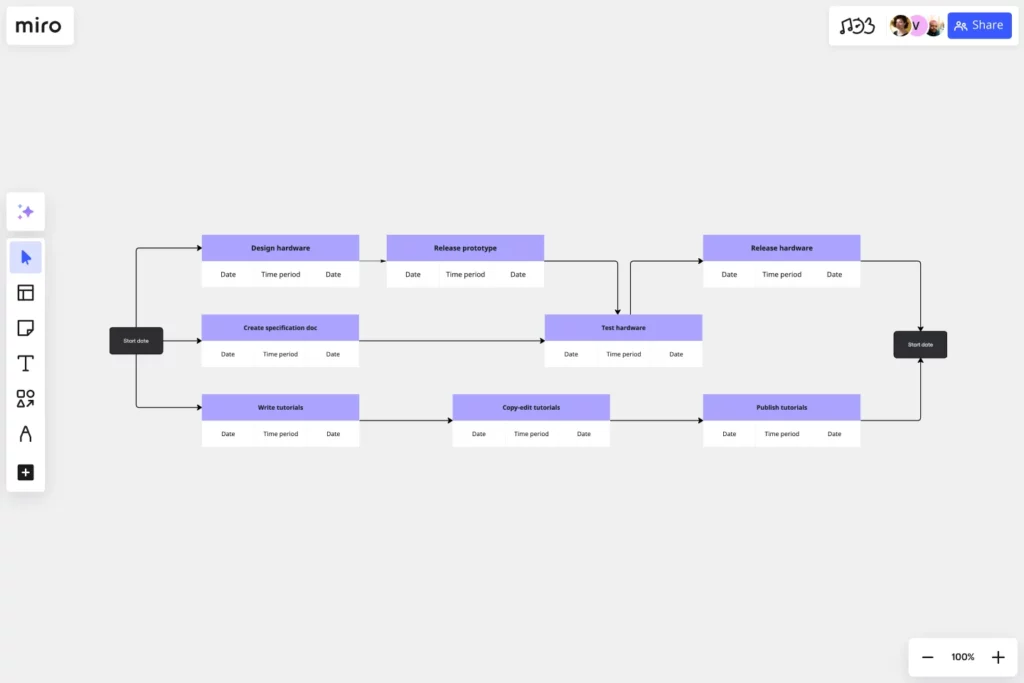 Miro se distingue comme un tableau blanc collaboratif en ligne, particulièrement utile pour la phase de préparation des diagrammes PERT. Il permet de créer des schémas personnalisés, de relier visuellement les différentes tâches et d’impliquer l’ensemble de l’équipe dans la modélisation du projet. Grâce à ses nombreuses bibliothèques de modèles et à ses fonctions de coédition, Miro facilite la construction de diagrammes logiques même complexes. C’est un excellent choix pour les ateliers de planification ou les brainstorming stratégiques autour de la structure du projet. Découvrez notre avis sur Miro.