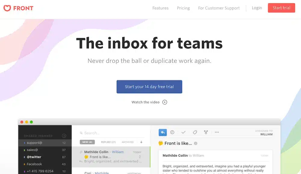 Front a été lancé en 2014 par Mathilde Collin et Laurent Perrin. Il s’agit d’un outil de messagerie professionnelle qui vise à rendre beaucoup plus souple, plus rationnelle et plus collaborative la gestion des emails. L’idée est par exemple de pouvoir gérer des adresses « contact@ » ou « recrutement@ » à plusieurs, sans devoir en passer par un système de transferts et de copies. Front a développé plusieurs partenariats technologiques (avec Salesforce notamment) pour pouvoir être intégré à d’autres solutions. L’application est aujourd’hui adoptée par de nombreuses entreprises de renom, de HubSpot à LVMH, et a connu plusieurs levées de fonds pour soutenir sa croissance.
