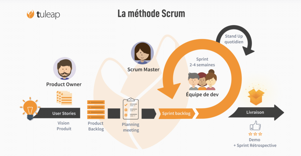 La méthode est donc un framework qui fournit aux équipes une organisation de travail en répartissant les responsabilités. L’objectif est d’améliorer la productivité et de produire un livrable de valeur en tenant compte des changements et en plaçant le client au cœur du processus.