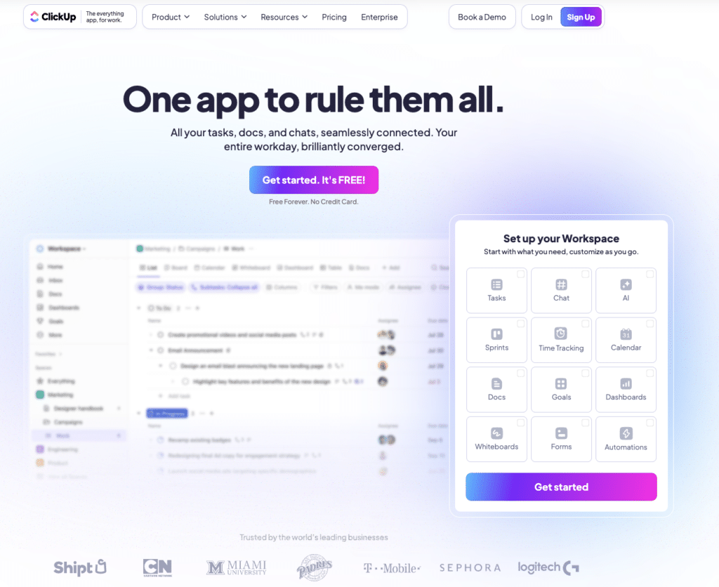 Cette plateforme de productivité californienne, créée en 2017, peut se targuer d’être une des plus complètes du marché. ClickUp offre une interface élégante pour créer, organiser et suivre des tâches simples ou complexes. Les listes de missions et les vues sont hautement personnalisables.