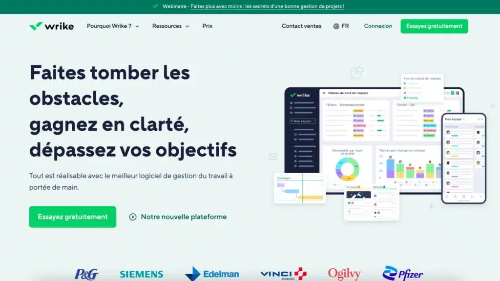 Wrike est une plateforme de gestion de projet qui garantit aux équipes une collaboration optimale grâce à une visibilité à 360°. Cet outil est aussi bien adapté pour les équipes marketing, RH, gestion de projet ou équipe informatique.