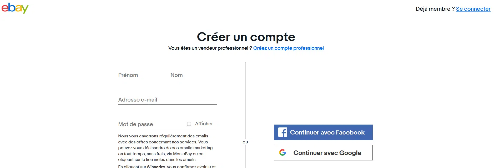 Première étape pour ouvrir votre e-commerce : rendez-vous sur eBay, dans la page de création de compte