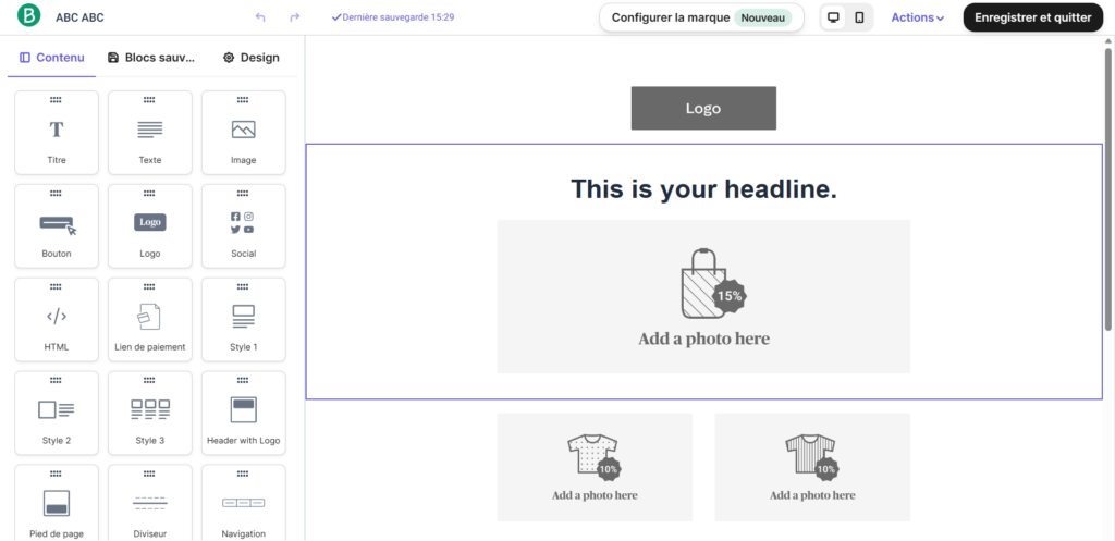 En outre, Brevo vous propose de conserver votre « bibliothèque de marque » pour garantir la cohérence de l’image de votre entreprise dans les mails et gagner du temps. Les éléments de marque, tels que le logo, les couleurs, les polices ou les liens de réseaux sociaux, peuvent être appliqués automatiquement au design de chaque nouveau template sélectionné.