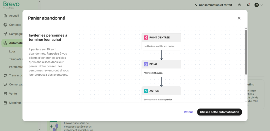 Brevo offre un grand nombre de scénarios prédéfinis (ex : message de bienvenue après inscription, email après l’achat, relance…) que vous pouvez facilement personnaliser. Vous pouvez créer vos propres scénarios en définissant le point de départ et les actions attendues.