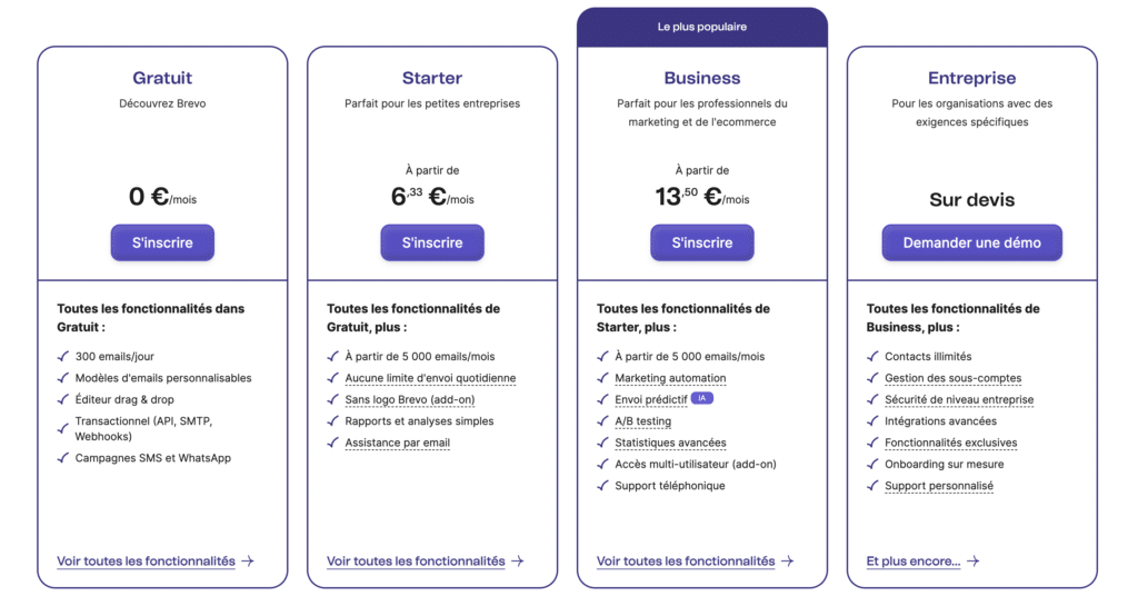 Pour cela, il est nécessaire de se tourner vers l’une des deux formules payantes Brevo donnant accès aux fonctionnalités avancées du logiciel et permettant d’envoyer autant d’emails que vous le souhaitez.