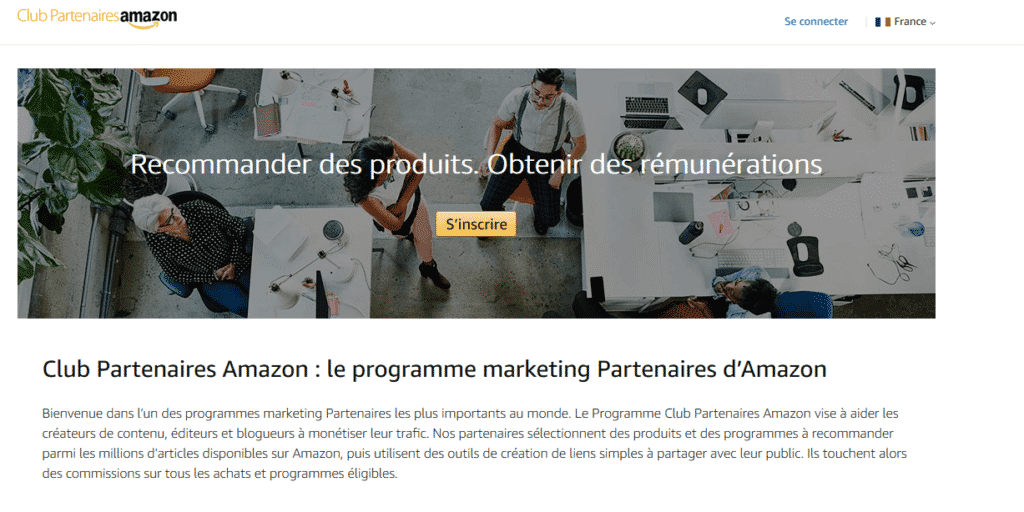 Pour s’inscrire au Club Partenaires Amazon, il vous faudra simplement cliquer sur « s’inscrire » en bas de la page d’accueil, puis suivre les instructions pendant quelques minutes. Vous pourrez ensuite instantanément commencer à sélectionner et à utiliser les liens d’affiliation de votre choix.