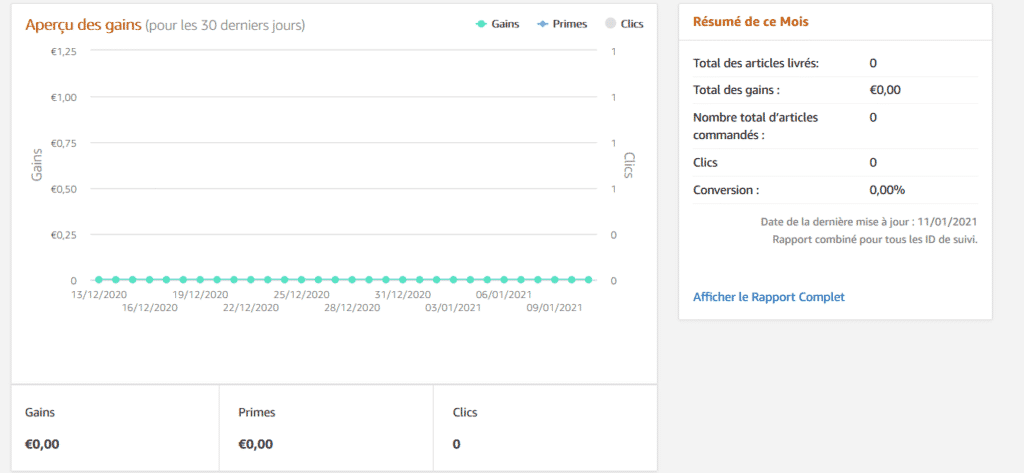 Vous aurez accès à un tableau de bord qui détaille vos gains journaliers et mensuels. Vous pourrez ainsi suivre vos performances, et envisager des améliorations afin de dégager toujours plus de bénéfices de vos liens d’affiliation Amazon.