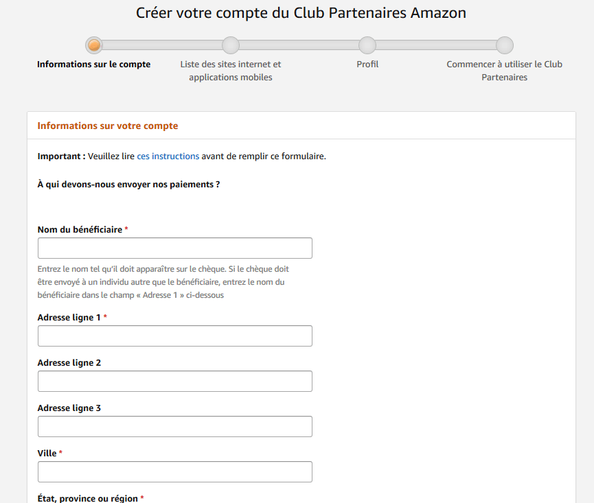 Étape #1 – Renseignez les informations sur votre compte Club Partenaires Amazon