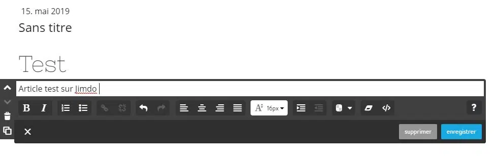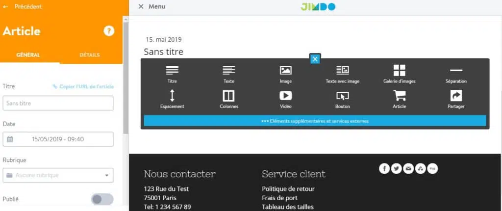 Pas vraiment le point fort de Jimdo, mais le périmètre fonctionnel est quand même large. L’édition d’un article de blog se fait de la même manière que l’édition d’une page, autrement, c’est simple et efficace. Très utile pour faire une passerelle intelligente entre les pages produits et le blog. Bizarrement, il faut utiliser l’éditeur HMTL pour structurer le texte avec les balises H2, H3, etc. Pas moyen de le faire depuis l’interface.