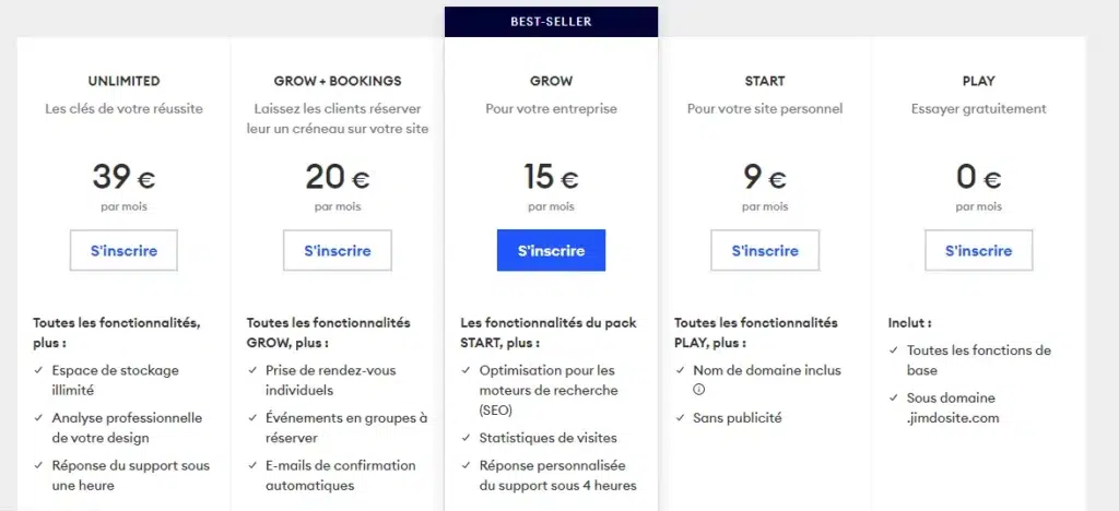 - Grow, à partir de 15€ par mois. L’offre de Jimdo pour un site web professionnel pensé pour les entreprises et les indépendants, facturée 15€/mois (en facturation annuelle soit 180€/an). Vous avez bien sûr votre nom de domaine personnalisé, l’accès à l’outil d’optimisation pour les moteurs de recherche (SEO) ainsi que 5 adresses e-mail de redirection.
