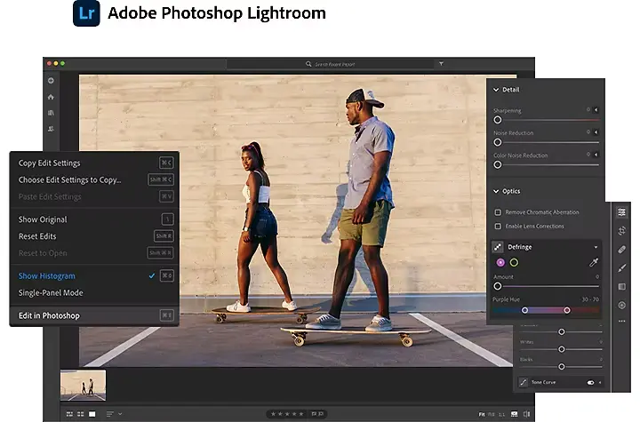 Adobe est vraiment la référence en matière de logiciel de retouche d’image. Si Photoshop se révèle trop complexe et encombrant, vous pouvez opter pour Adobe Lightroom. Lightroom qui vous permet de modifier vos photos dans une interface simple et intuitive avec une multitude de fonctionnalités fantastiques. La détection de visage pour l’organisation de photos, les réglages du pinceau et du dégradé, les outils de fixation et de flou, les filtres professionnels ou encore les curseurs personnalisables