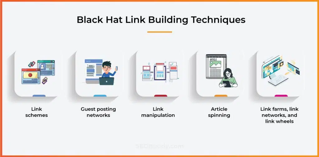 Certaines plateformes de netlinking ou spécialistes du SEO utilisent encore des techniques dites Black Hat pour obtenir des backlinks en masse, rapidement. Cela inclut :