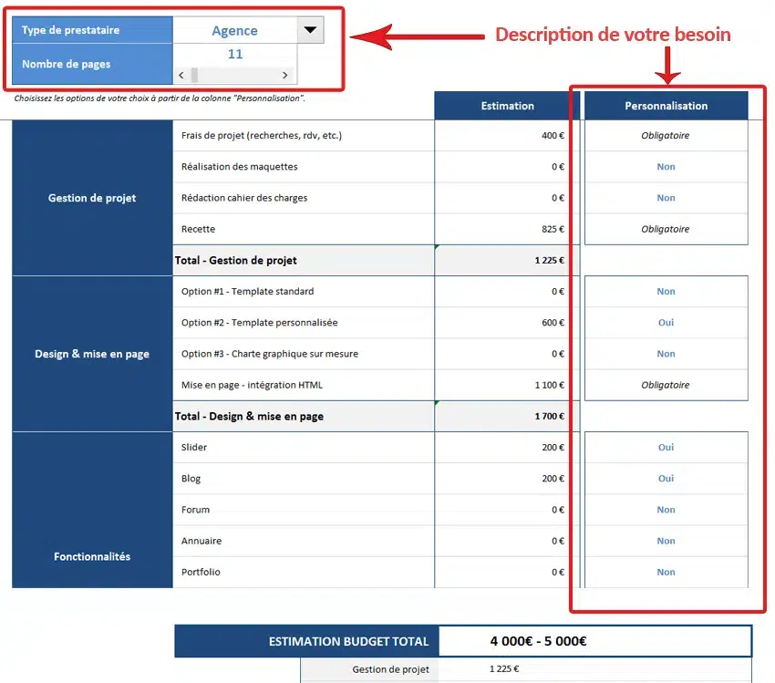 La Fabrique du Net met à votre disposition un modèle Excel de calcul de coûts. Il vous permettra d’évaluer au mieux le budget à prévoir pour la création de votre site vitrine. Le screenshot présenté ci-dessous vous explique comment utiliser ce modèle.