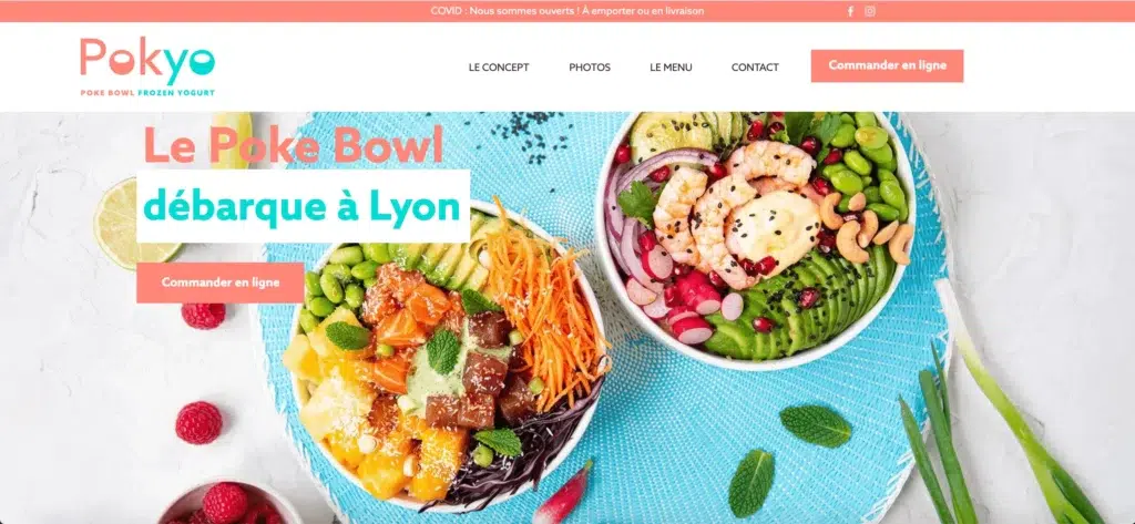 De beaux visuels colorés des plats, la possibilité de voir le menu et une jolie galerie d’images… ce sont les caractéristiques qui font de ce site de restaurant à Lyon une belle réussite. Il est même possible de commander directement en ligne, cette fonctionnalité étant alors gérée par Clickeat. On aime la simplicité de ce site, où tous les éléments attendus pour un restaurant sont présents : la carte, des photos, des informations de contacts et quelques mots sur l’identité. En 3 mots, simple, efficace et esthétique. Pokyo, un bel exemple de site réalisé avec Wix !