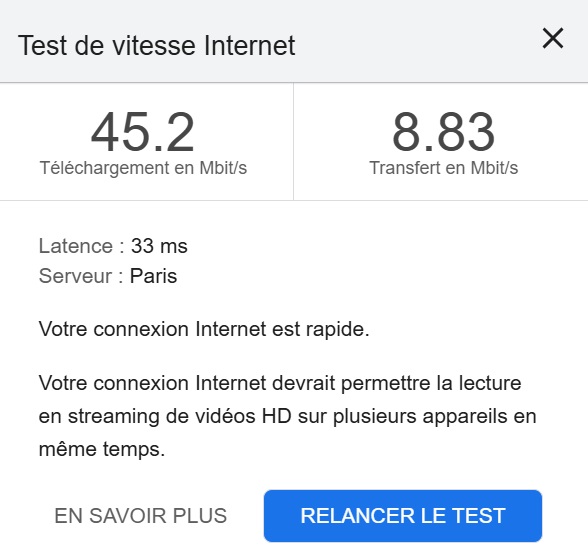 - Un téléchargement à 45 Mbit/s et un transfert à 8 Mbit/s, comme sur l’image, permettent de regarder des vidéos HD sur plusieurs dispositifs