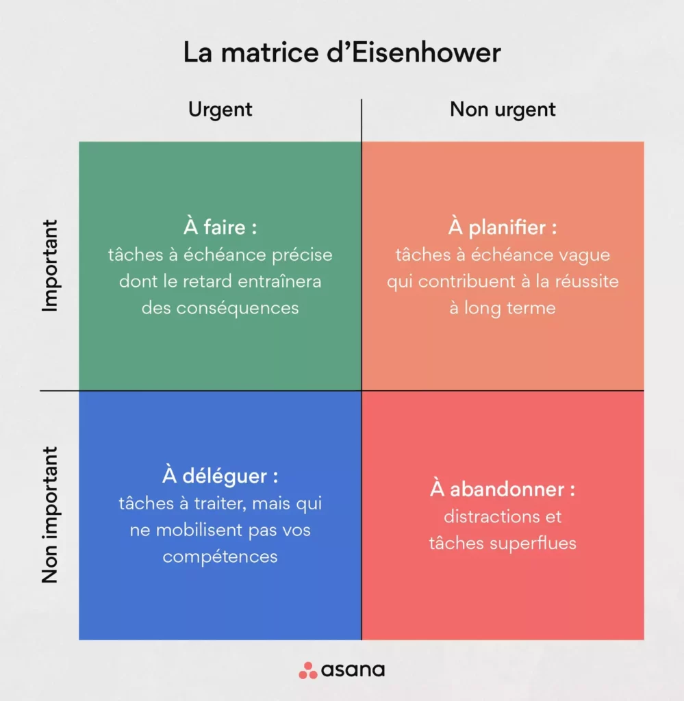 La matrice d’Eisenhower tire son nom de Dwight D. Eisenhower, 34ème président des États-Unis. À l’origine un outil de stratégie militaire, elle a ensuite été adaptée au management et à la gestion du temps. Son principe est simple mais efficace : classer ses tâches selon deux axes, l’importance et l’urgence.