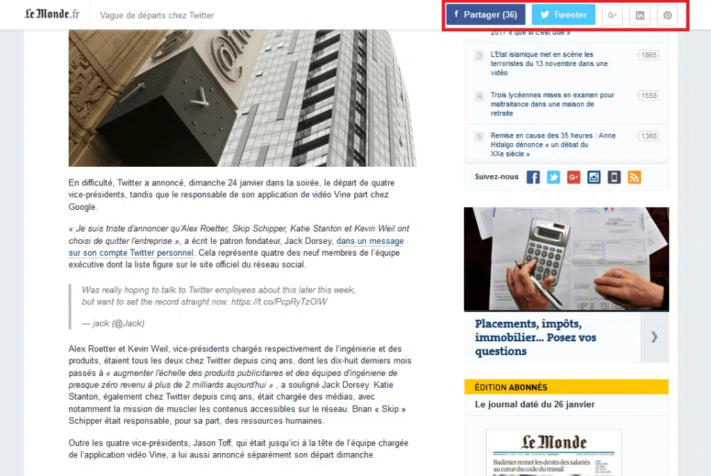 Autre conseil : mettez en avant les boutons de partage sur votre site internet. Il faut que les internautes qui lisent vos articles depuis votre site internet puissent facilement le partager sur leur page personnel sans devoir chercher les boutons de partage ou copier eux-mêmes le lien sur leur fil d’actualité. Tester différents endroits pour l’affichage de vos boutons afin de déterminer le plus efficace.
