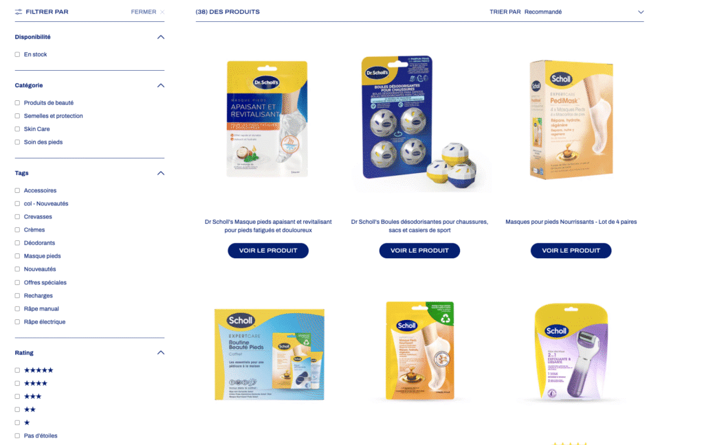 Comme vous pouvez le voir sur le côté gauche, le nombre de filtre disponible est vraiment important. Vous pouvez sélectionner le type de douleur que vous ressentez, la forme du produit ou encore la technologie utilisée afin d’obtenir les semelles vraiment adaptées à vos besoins. L’autre chose à souligner, est la présentation des produits avec une photo, mais aussi une petite description et la note des clients. Ce qu’il y a de bien ici, c’est que le futur acheteur n’a pas besoin de cliquer sur la fiche produit pour avoir accès à ces informations. En un coup d’œil, il peut voir si ce produit lui correspond et s’il a été apprécié des autres acheteurs. Un gain de temps non négligeable.