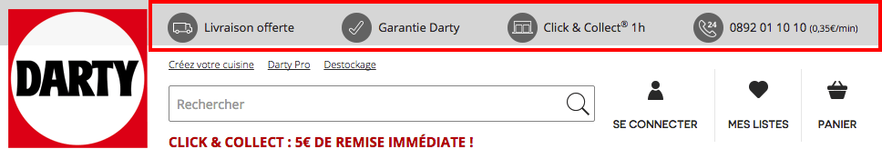 Exemple du site de Darty, qui met en avant la réassurance dans son header :