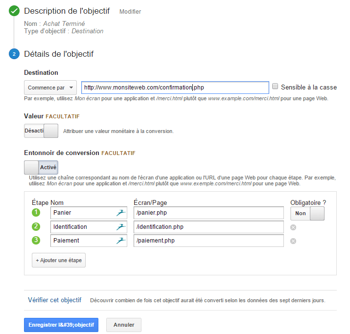 Chaque étape est définie, dans Google Analytics, par une URL. Si entre deux de vos étapes, aucun changement d’URL n’intervient (en cas de popup par exemple), vous pouvez mettre en place des pages vues virtuelles. Vous trouverez toutes les informations nécessaires pour mettre en place et analyser votre entonnoir de conversion dans la documentation Google.