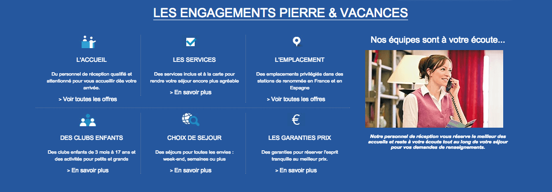 N’hésitez pas non plus à faire mettre en évidence sur votre site vos arguments commerciaux, par exemple dans le prefooter sous forme de bandeau. Voir ci-dessous l’exemple de Pierre et Vacances :