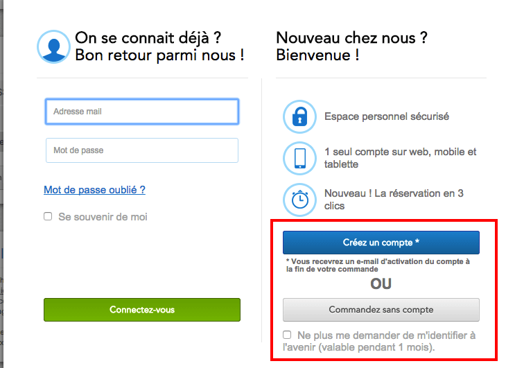 Typiquement, il est déconseillé d’obliger les internautes à créer un compte pour finaliser leur achat. Vous verrez, si vous utilisez et analysez votre entonnoir de conversion (voir plus haut), les impacts très négatifs de cette pratique. Beaucoup d’internautes n’ont tout simplement pas envie de créer leur compte et abandonneront si on leur demande. Vous pouvez toujours laisser la possibilité à l’internaute de créer son compte ou de poursuivre sans créer de compte. C’est le choix qu’a fait le site Voyages SNCF.