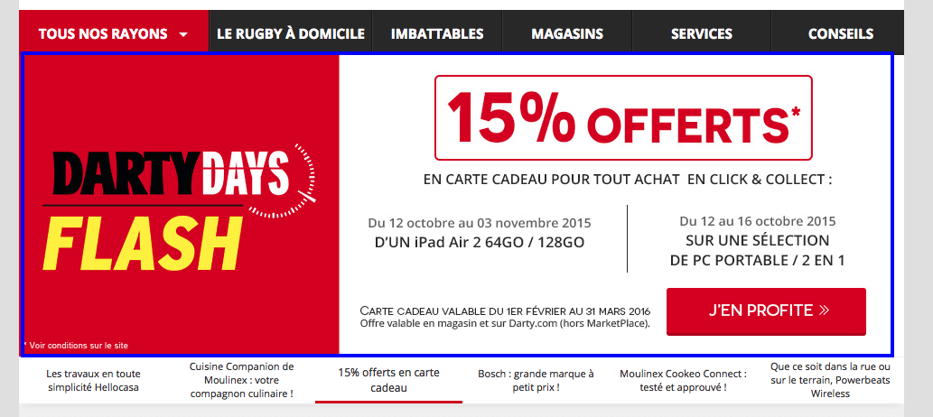 C’est bien connu, les clients adorent les promotions. On ne l’apprendra à personne. Du coup, mettre les promotions commerciales en avant est un bon moyen d’améliorer votre taux de conversion. La plupart des images du carrousel de Darty sont par exemple centrées sur la présentation des promotions commerciales (mais Darty n’est pas le seul à avoir eu cette idée, loin de là) :
