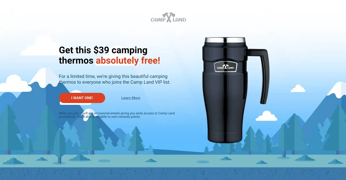 Camp Land est un modèle de landing page proposé par des plateformes spécialisées comme Leadpages ou des alternatives modernes telles que Unbounce ou Systeme.io. Même si le modèle lui-même est gratuit, un compte sur la plateforme choisie est nécessaire pour l’utiliser. Si vous construisez des pages de destination pour vendre des produits, Leadpages est une bonne option car elle s’intègre à Stripe et à diverses plates-formes de commerce électronique. Vous disposez également d’une bibliothèque complète de pages de destination pour les produits. Avec Leadpages, l’accent est mis sur la maximisation des conversions. Chaque modèle est fourni avec un espace dédié pour un titre de proposition de valeur et des outils pour créer un sentiment d’urgence, de rareté et d’autres formes d’incitation à rendre vos CTA irrésistibles.